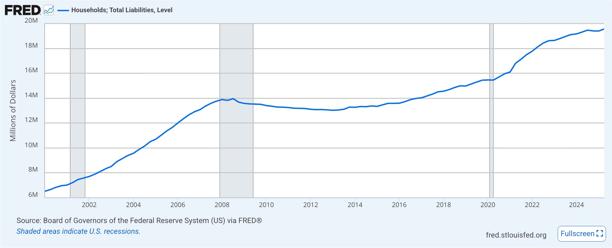 But given the bottom half of Americans own just 6% of financial assets, they’ve been treading water for 25 years. Floated by personal debt that tripled from $6.5 trillion in 2000 to $19.5 trillion today.