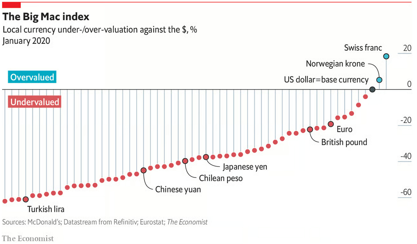 The reason is the Big Mac is the same everywhere in the world, and it captures a wide range of prices -- wages, rents, food, energy, gasoline, insurance, regulation.