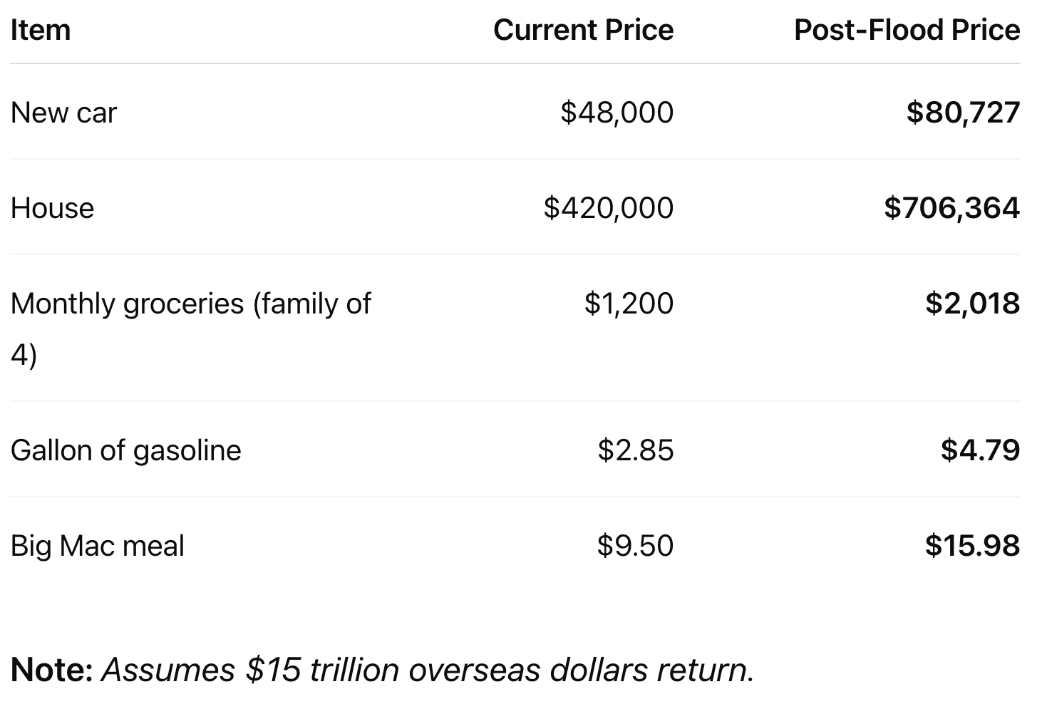 Which could nearly double domestic prices as they dilute dollars already circulating in the US — dramatically more dollars chasing the same amount of goods.