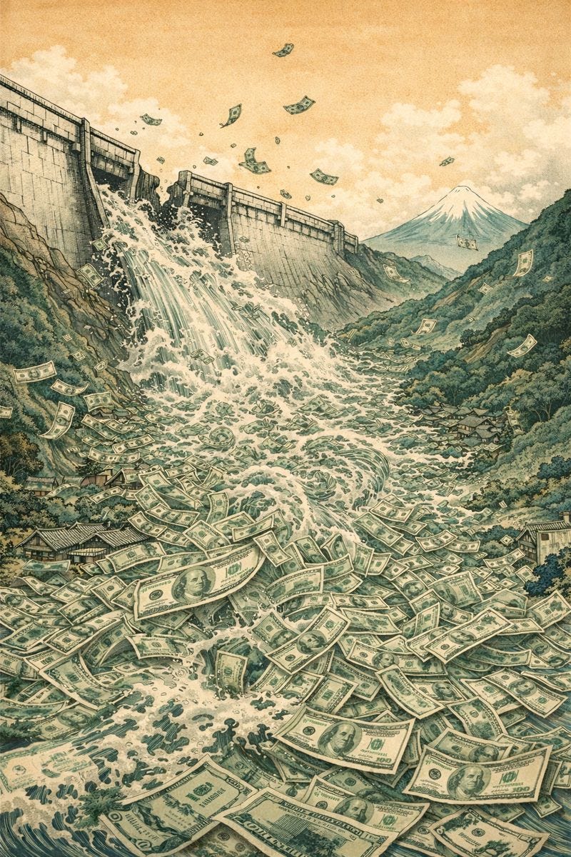But here’s the problem: Think of all the dollars in the world like a giant reservoir with rivers of freshly printed dollars pouring in. Some from the Fed, some from Wall Street banks lending dollars into existence with fractional reserve — the true exorbitant privilege.