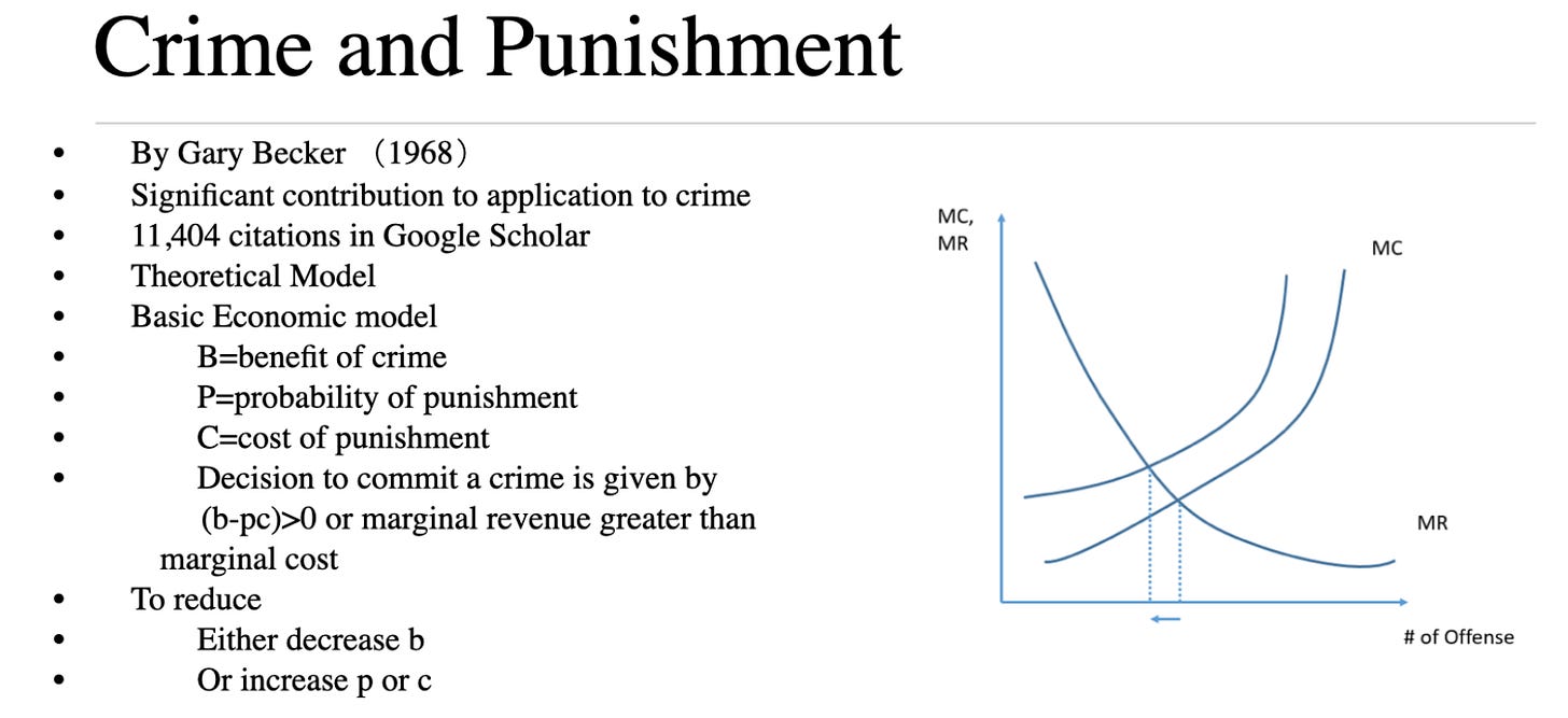 These slashed the odds of doing time -- Nobel Economist Gary Becker estimated that by the late 60's the expected sentence for murder was just 5 years. For robbery it was 3 months. For car theft or burglary it was less than 2 weeks.
