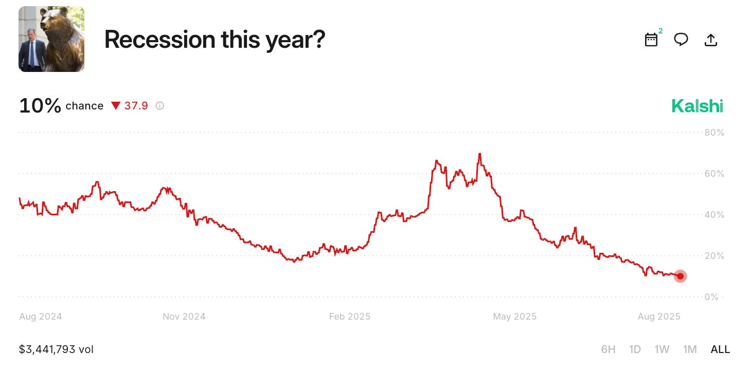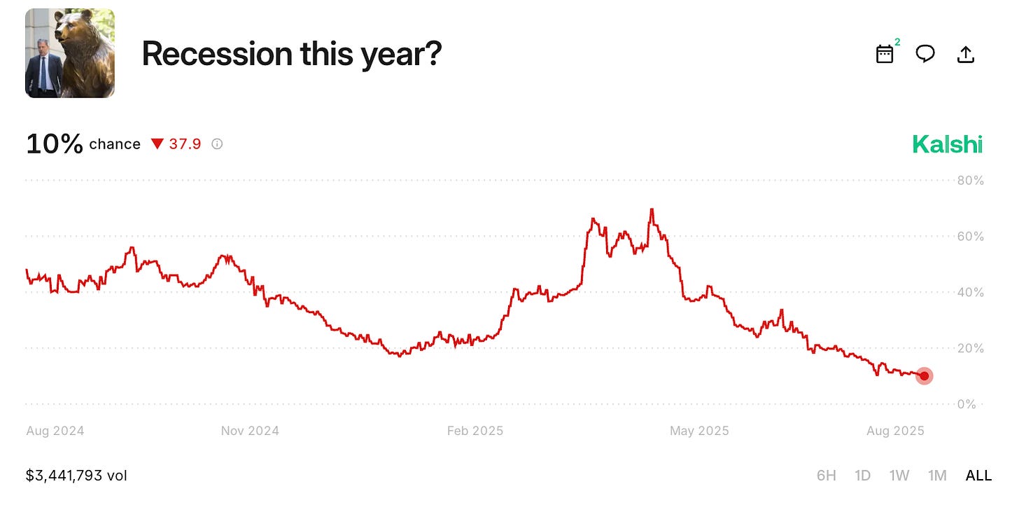 The easiest way to clear through the smoke is markets that crowdsource recession odds. Prediction market Kalshi is currently running just 10% odds of a recession this year.
