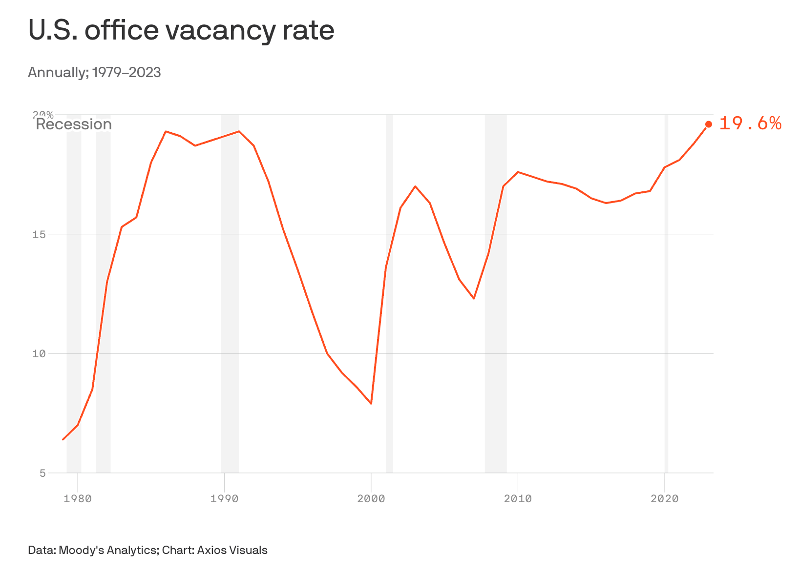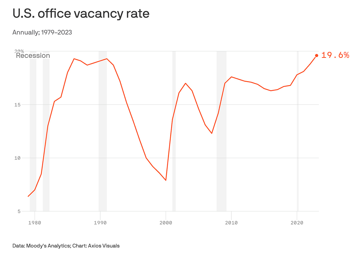 Regional banks were already sitting on land-mines in the crashing commercial real estate sector, with office vacancy rates hitting a record 20% -- in 2019 it was 12%.