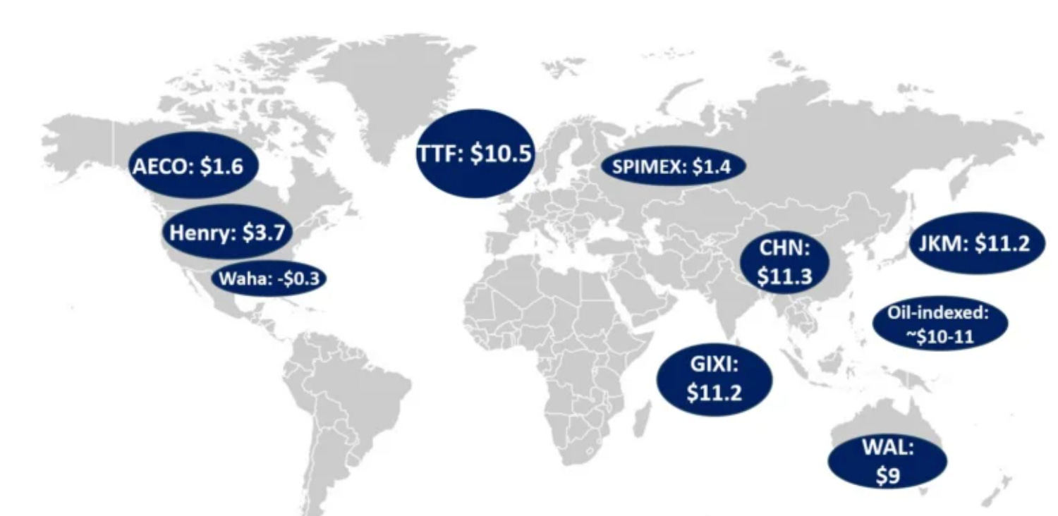 This means there isn’t a global price for natural gas, it’s different prices everywhere. "Henry Hub” in the US. Japan-Korea Marker -- JKM -- in Asia. And TTF in Europe.