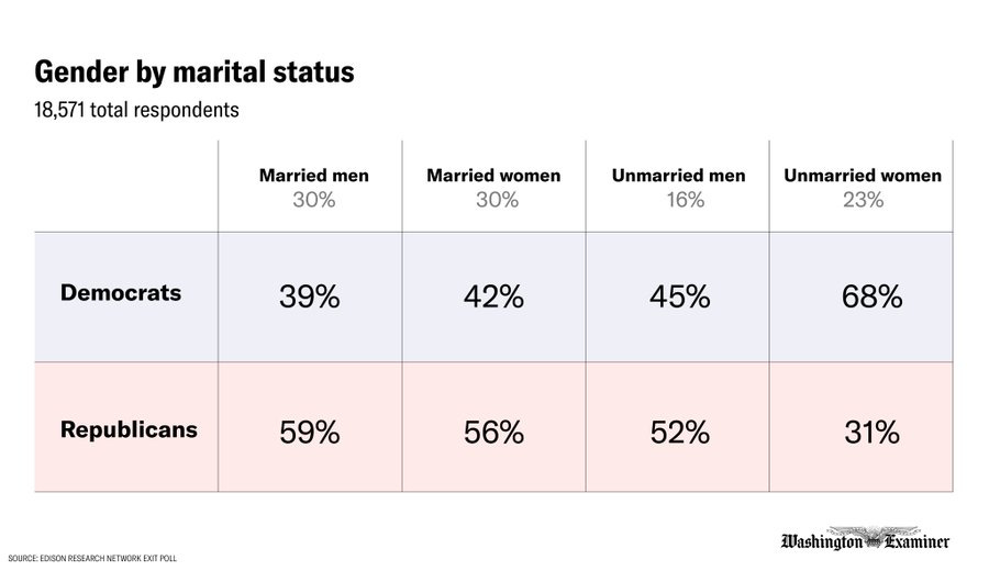 Interestingly, it's only single women: Married women actually vote Republican by 5 points -- the same as men. While single women vote Democrat by 48 points.